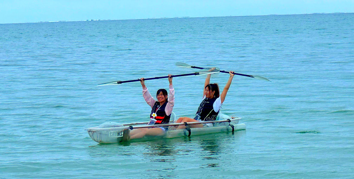 沖縄に行ったらどうしても乗りたいと思っていました。 カヤックを漕ぐことも初めてでしたが、思っていたより簡単でしたが、風に流されやすいので気づくとかなり進んでいます。 スタッフの方が近くについて誘導してくれるので安心です^^ 遠浅の砂浜が沖まで続くので、常に足がつくところだという安心感もありました。 しばらくして水中スクーターを使い、海の中を堪能しました。色鮮やかな魚がたくさんいてこれもまた、熱中しすぎて沖に出ていました。時間目いっぱい遊べてとても大満足です。 ただ、更衣室等はないので、行きは先に着ていくことをおススメします! シャワーは近くに有料(100円)の施設がありました。